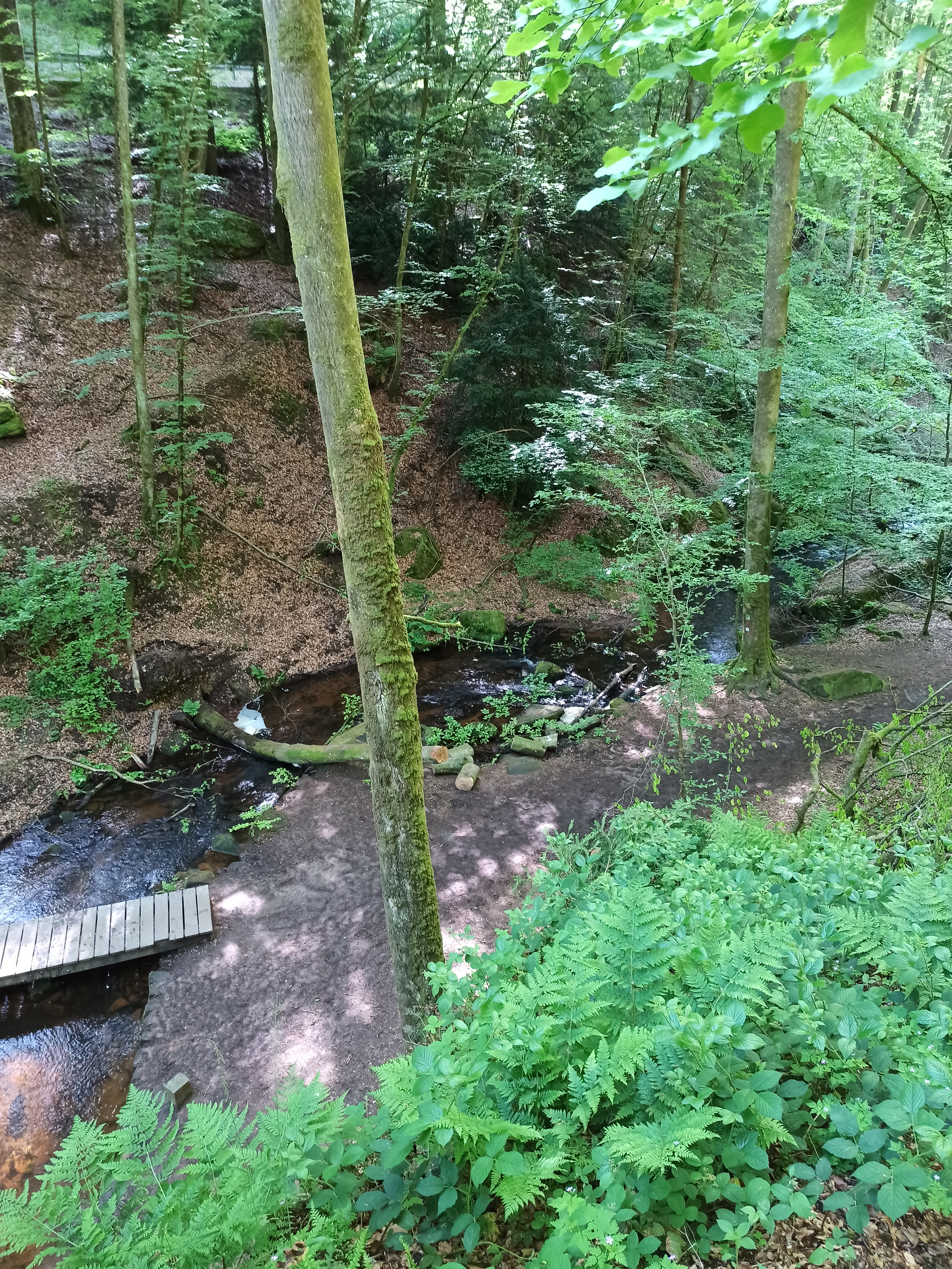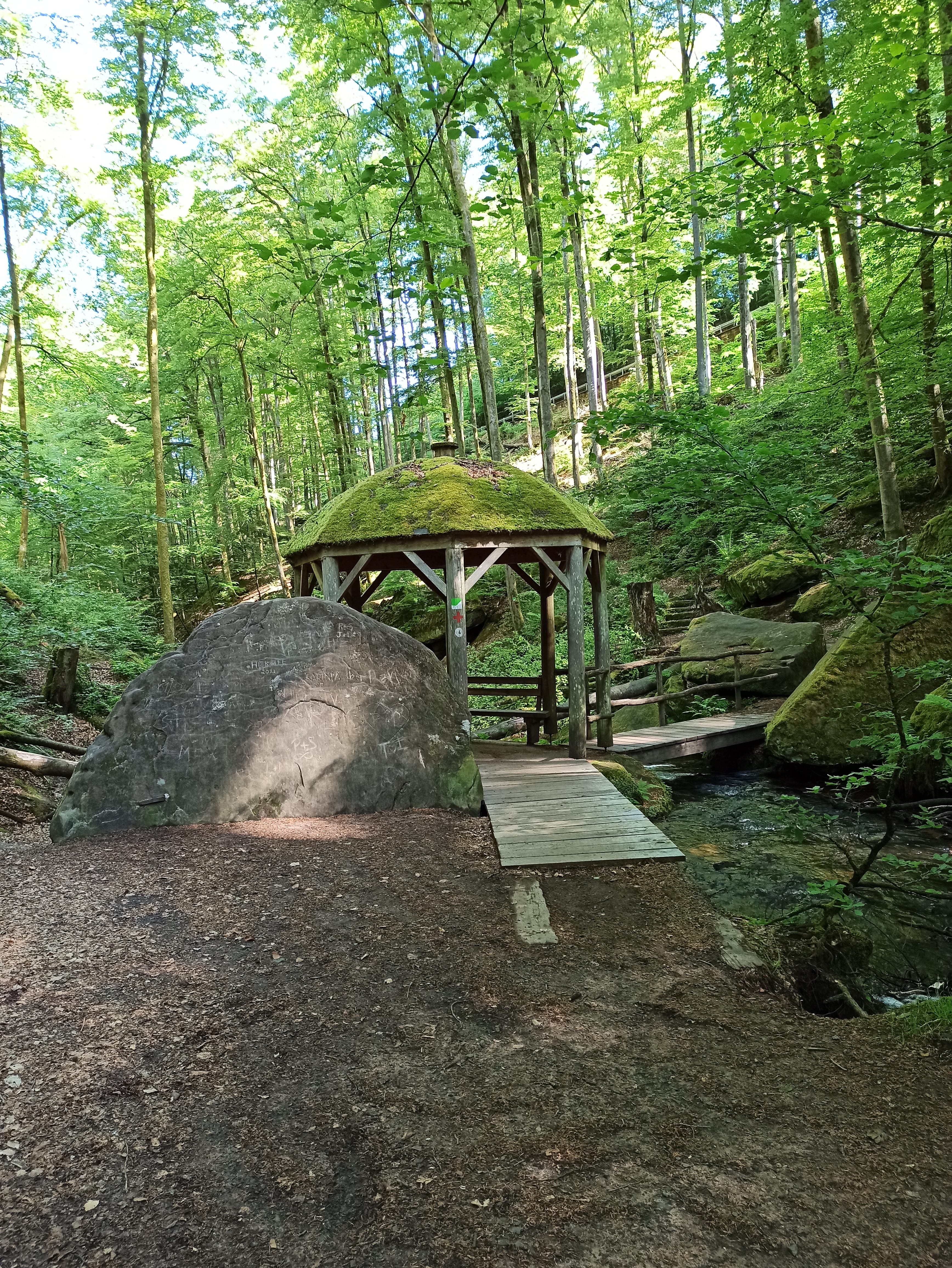 Ausgangspunkt für die perverse 17-Kilometer-Tour war die Karlstalschlucht, ein kühler Geländeeinschnitt mit rauschendem Bach, kleinen Holzbrücken, die den Wasserlauf queren, einem hübschen Pavillon und sogar einer ehemaligen, uralten Einsiedelei, die man nur über einen steilen Pfad erreicht. Für einen Moment ist man versucht, so eine Einsiedelei für sich zu akquirieren um diesem ganzen woken Gesockse zu entfliehen, aber naja.