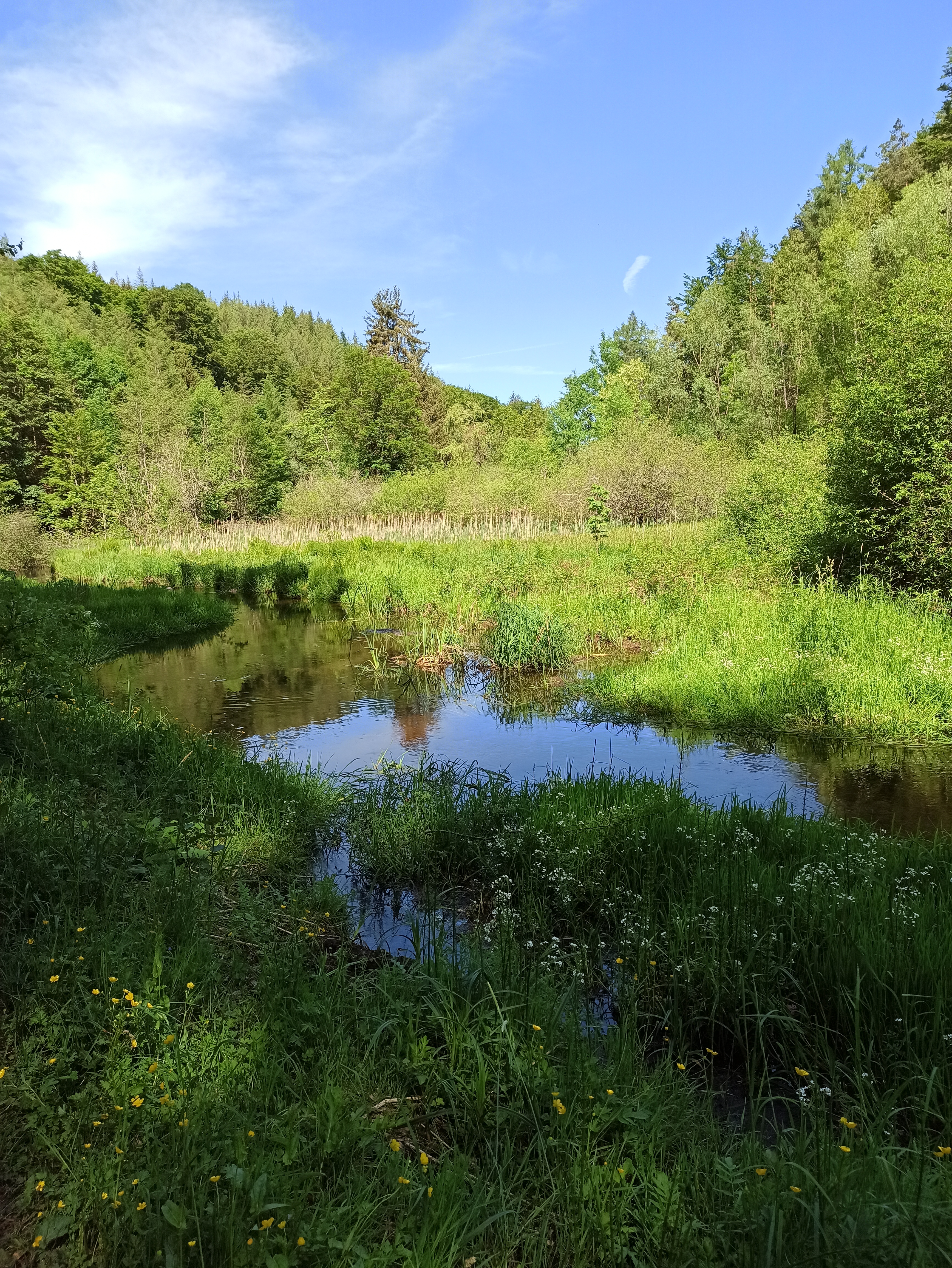 Nach wenigen Kilometern erreicht man die Moosalbe, ein Fließgewässer, das bis zur Mündung in den Schwarzbach ein sehenswertes Tal geschaffen hat. Auf ihrem Weg finden sich mehrere ehemalige Hammerwerke zur Metallverarbeitung, an die entlang des Wegs auf Infotafeln erinnert wird. Deutsche Industrie! Die in der Moosalbe trauen sich vielleicht was, an solch finstere Zeiten zu erinnern!