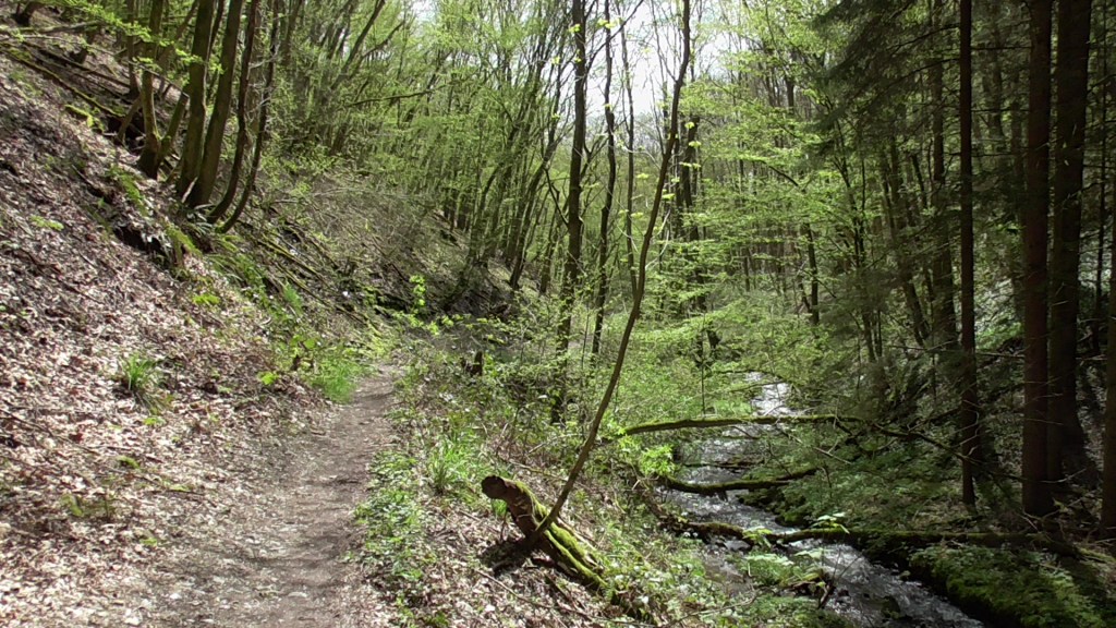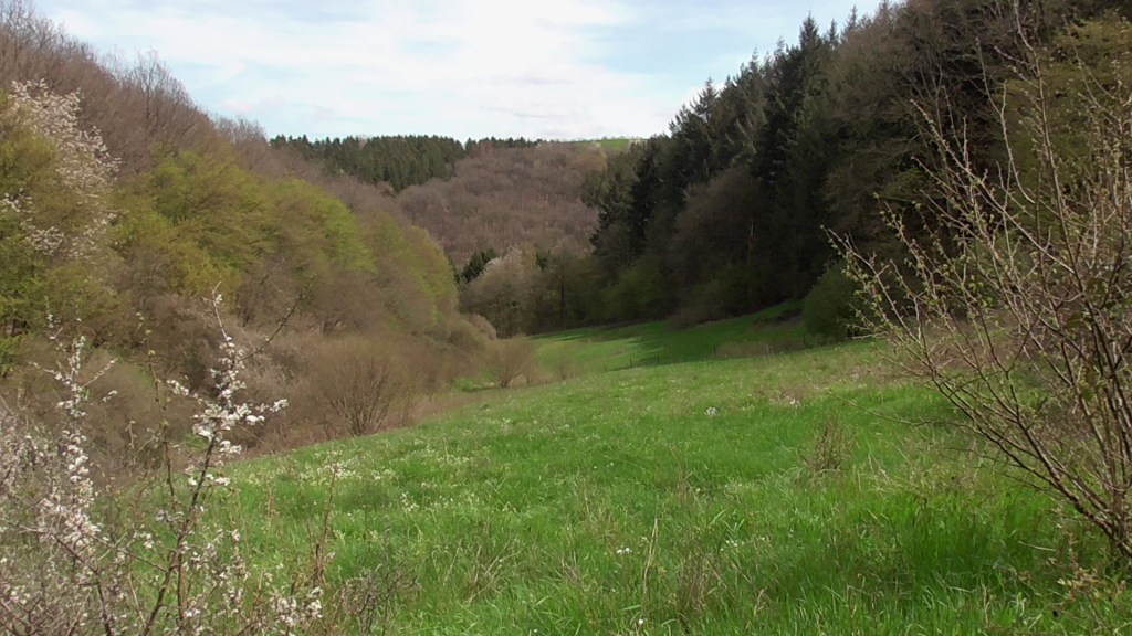 Die Drohn begleitet uns ein ganzes Stück durch ein wunderschönes, grünes Tal. Dann wieder bergauf, zweite Pause am Sportplatz von Merscheid gemacht, ein Stück der Straße folgend und dann wieder sanft ansteigend über freies Feld Richtung Wald. Auffallend auf diesen knapp 2 Kilometern Waldweg: Alle paar Meter kommen kleine Bäche aus dem Wald geflossen, die sich rechts des Wegs in einer Rinne sammeln und auf der anderen Seite weiter ins Tal fließen, vielleicht in den Hölzbach (siehe Video)