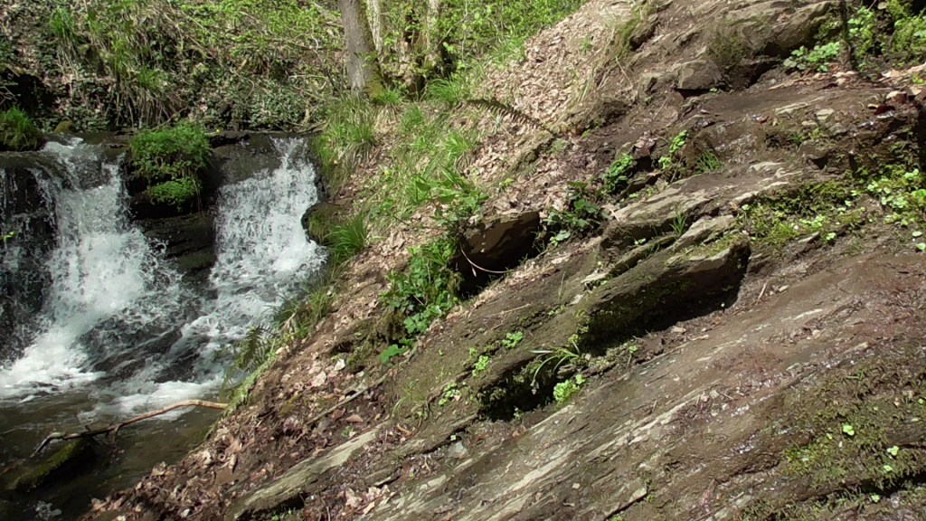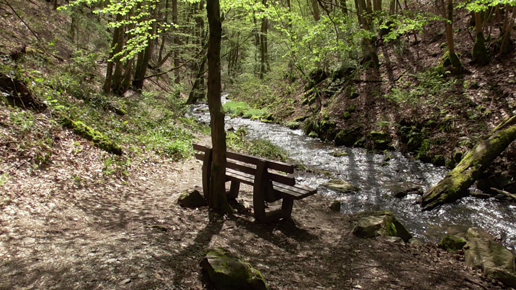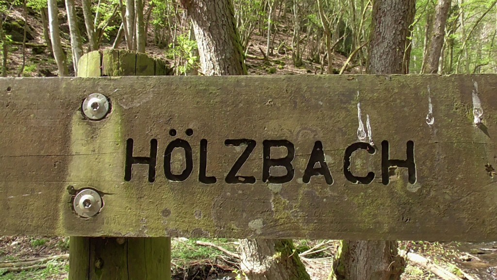 Erst ging es angenehm bergab über asphaltierte Wege, dann endlich durch dichten Wald in die Klamm. Gefühlt alle kleinen Bäche und Rinnsale der Umgebung scheinen im Hölzbach zu münden. Auf einem schmalen, an einer Stelle sogar mit Drahtseilen gesicherten Weg folgt man dem wild rauschenden Bach mit seinen Wasserfällen hinunter ins Tal, wo er dann schließlich in die Drohn mündet, ihrerseits ein Zufluss der Mosel. Auf halber Strecke auf der Bank (siehe Bild unten) dann Pause gemacht, dem Wasser gelauscht und heftig erschrocken, als plötzlich jemand laut „Hallo“ rief. Da denkt man an nix Böses und dann haben tatsächlich noch andere die Idee gehabt, dort wandern zu gehen 😉 Im weiteren Verlauf blieben mir Begegnungen mit Menschen aber glücklicherweise erspart.