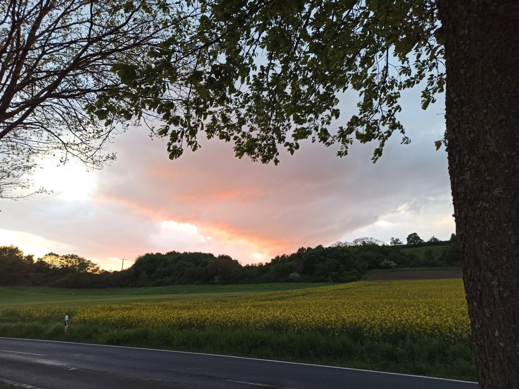 Das letzte Drittel des Weges gestaltete sich dann doch etwas anstrengend. Zuerst über normale, teils auch asphaltierte Feldwege vorbei an wunderschönen Rapsfeldern nach Keldung, einem Ortsteil von Münstermaifeld, hatte ich es im Anschluss mit nassen und rutschigen Wegen zu tun, auf denen das Gras hüfthoch wucherte, so dass man kaum zwischen Weg und angrenzendem Acker unterscheiden konnte. Mit dem nicht ganz so angenehmen Resultat nasser Klamotten und Schuhen.