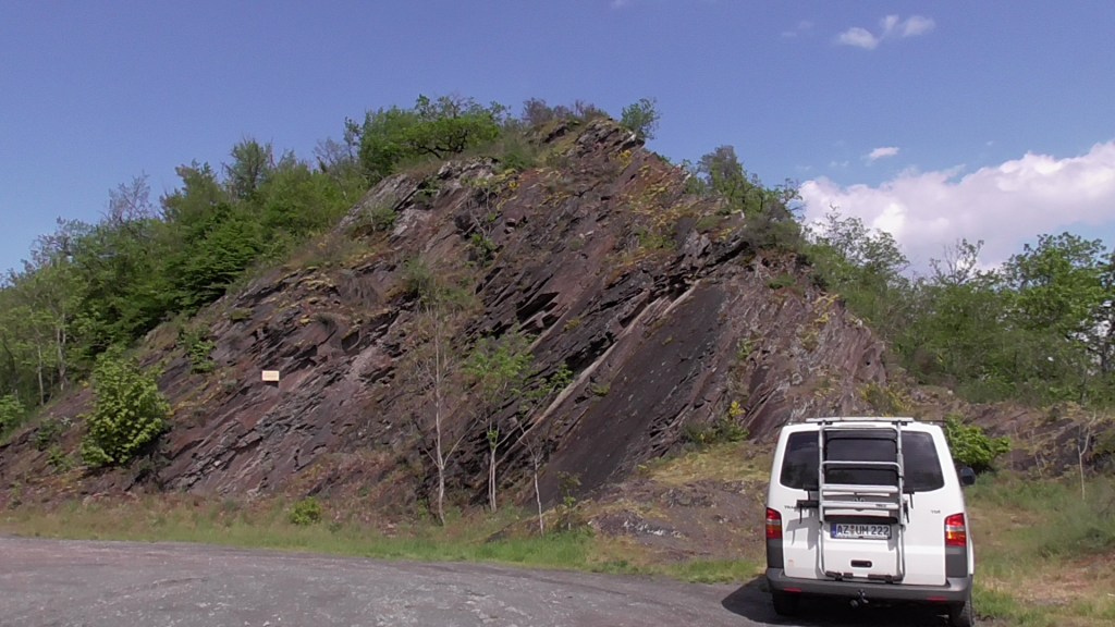 Meine Tour startete oberhalb der Pyrmonter Mühle am Fuße der gleichnamigen Burg. Vor einem imposanten Basaltfelsen durfte der Bulli auf mich warten. Hinter der Mühle, direkt beim beeindruckenden Elzwasserfall, begann eine relativ einfache Rundwanderung mit moderaten Anstiegen entlang der Elz, durch lauschige Wiesentäler und dichte Waldabschnitte. Die beiden Burgen Pyrmont und Eltz habe ich bewusst ausgespart, bei dem schönen Wetter waren die vermutlich von Menschen überlaufen und das muss ich auf so einer Wanderung nicht wirklich haben.