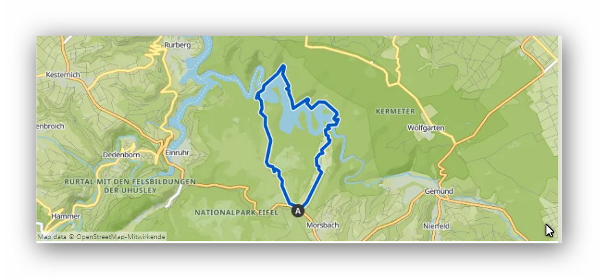 Eine 15km-Runde von der ehemaligen „Ordensburg“ Vogelsang, entlang am Urftsee und dessen imposanter Staumauer, zurück über das zerstörte Dorf Wollseifen.