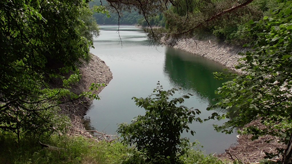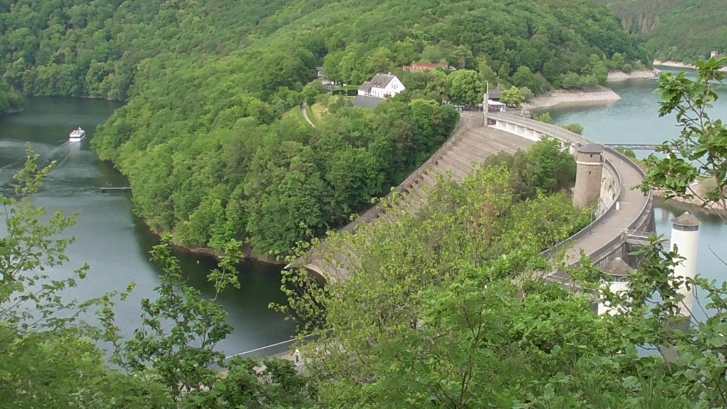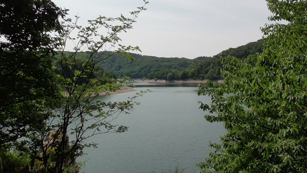 Runter ins Tal überquert man den Urftsee auf der Victor-Neels-Brücke und schlurft dann, teils im Schatten, teils in praller Sonne, etwa 5 Kilometer immer am Ufer des wunderschönen Sees entlang zur imposanten Staumauer.