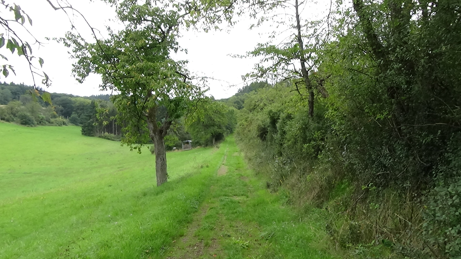 Entlang einer Nebenstraße gelangt man – beäugt von einer Gruppe schöner Pferde, die sich unbeeindruckt ihr Gras schmecken lassen – nach Oppenhausen und von dort nach Hübingen, wo nicht weit entfernt der Bulli auf mich wartet, mit dem ich dann (siehe oben) wieder nach Oppenhausen zurückgefahren bin, weil es da für die Nacht dann doch ruhiger war.
