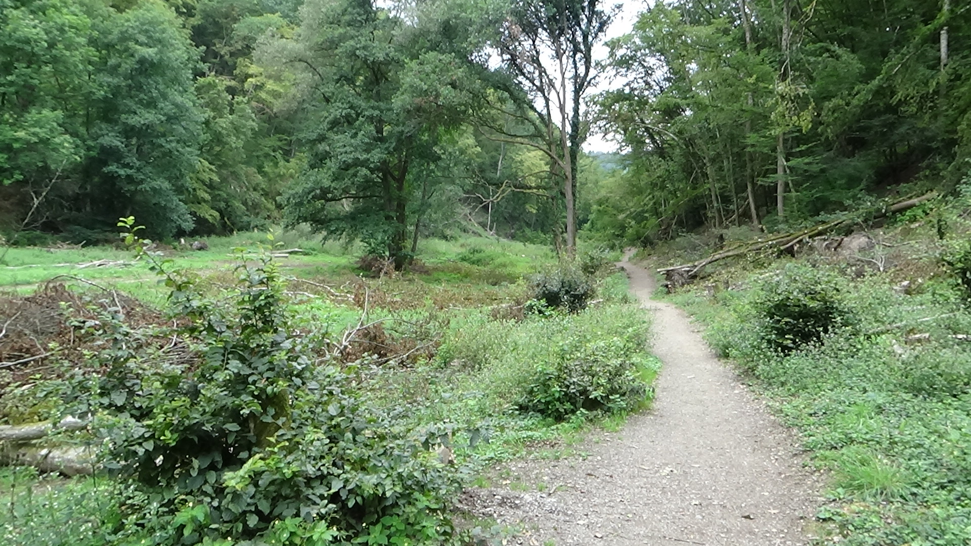 Zuerst ganz unspektakulär durch ein Stück Wald, anschließend über freies Feld runter ins Tal, dann über einen ziemlich steilen, geröllhaltigen und durch die „furchtbare anhaltende Dürre“ stellenweise schlammigen und rutschigen Weg – auf dem es mich das erste Mal hingehauen hat – in die Klamm.
