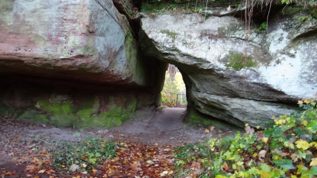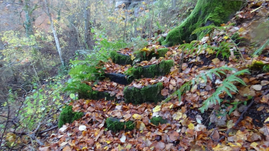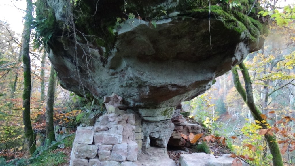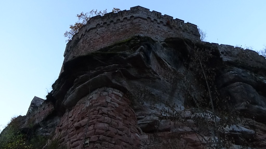 Weiter führt der Weg bergab ins Diemersteiner Tal, wo es ziemlich fies anfängt zu regnen und sich die Runde wieder unterhalb der Burgruine schließt. Eine kurze Regenpause wird genutzt, um hinauf zu gehen. Die Burg selbst ist in Privatbesitz und kann nicht besichtigt werden, jedoch hat sie ein paar spannende Ecken zu bieten, jedenfalls für jemanden, der verwitterte, jahrhundertealte Treppen mag und an ihnen nicht vorbeigehen kann, ohne zu gucken, wo sie hinführen. Diese Treppen führen zu einem seltsamen Felsen neben der Burg, der ein bisschen an den Teufelstisch bei Hinterweidenthal erinnert. Man fragt sich natürlich, weshalb diese aufwändige Treppenkonstruktion errichtet wurde. War der Felsen etwas Besonderes? Ein Teil der Burg wofür auch immer?
