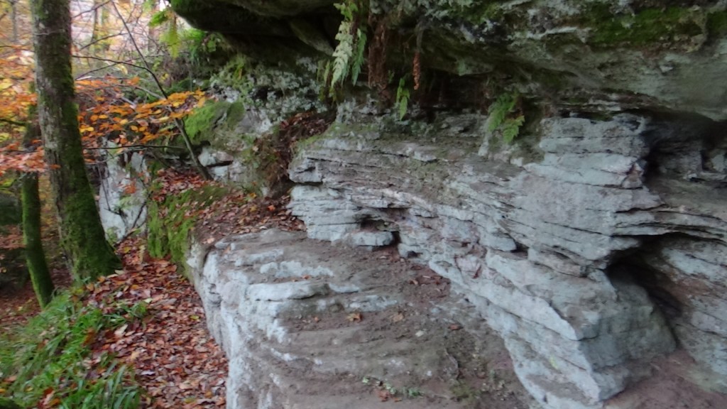 Nicht lange und der Autobahnlärm verschwindet hinter den Bäumen. Wir kommen am „Müllerstisch“ vorbei, einem sogenannten „Ritterstein„, wie es sie wohl mehrfach im Pfälzer Wald gibt. Mir ist bislang noch keiner begegnet. Am Müllerstisch jedenfalls hat man Bänke drumherum gebaut, die allerdings auch schon mal bessere Zeiten gesehen haben.