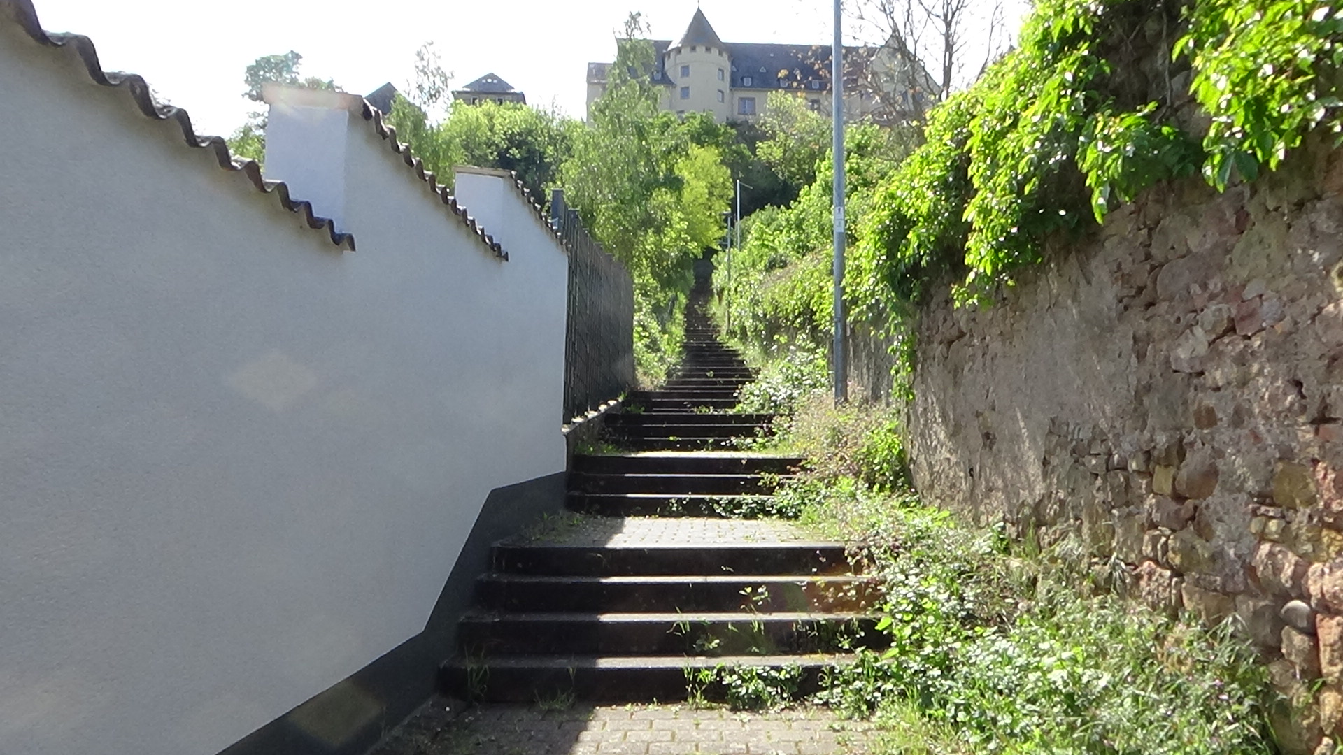 Es geht über eine Wiese, dann ein Stück durch den Ort, bis man schließlich vor einer ewigen Treppe ankommt, die hoch zur Burg führt.