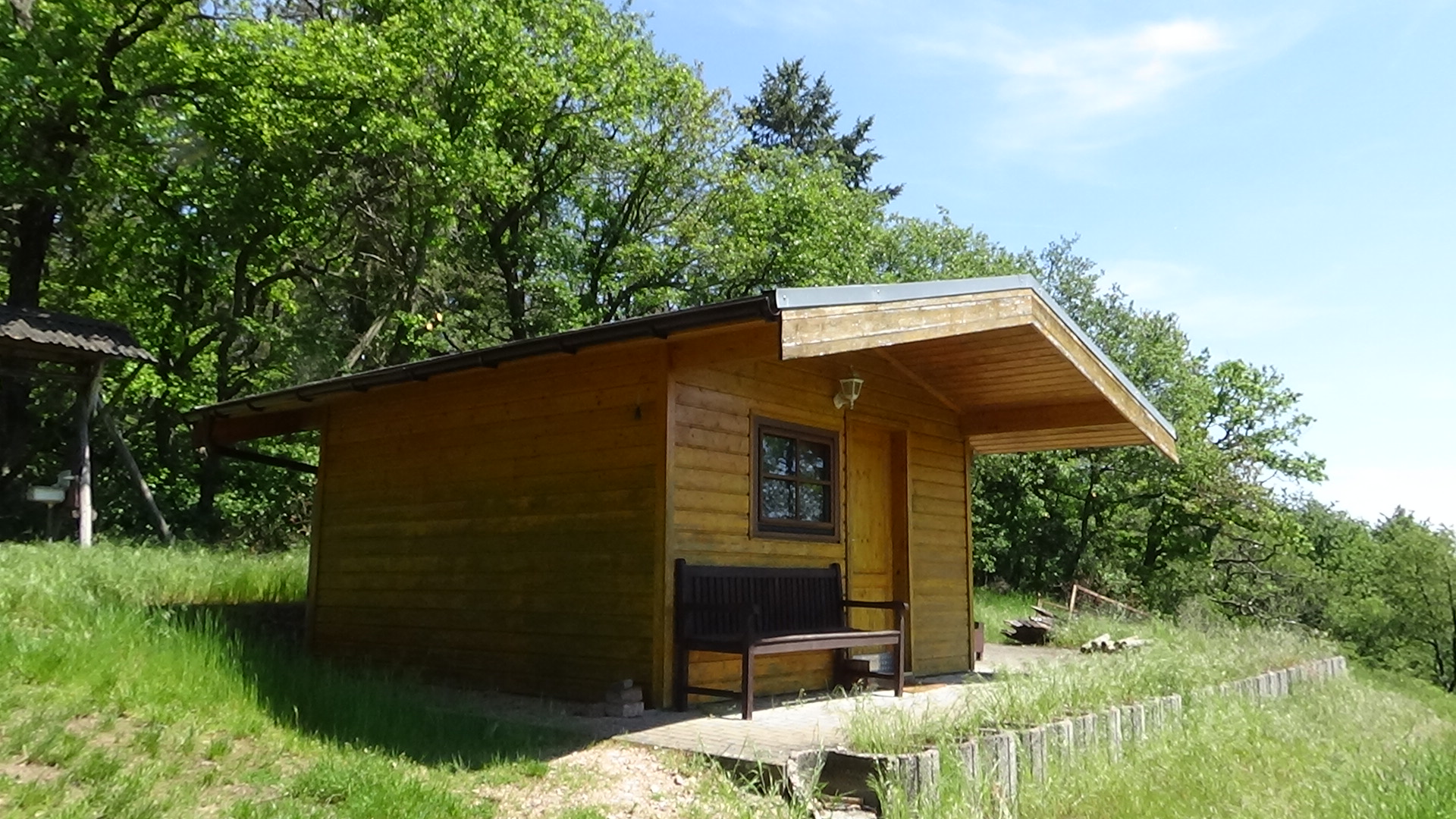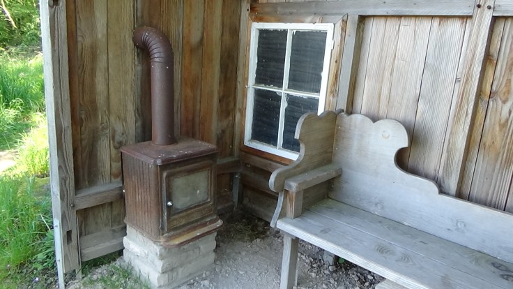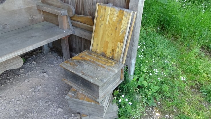 Auf so einer Tour freut man sich ja über jede Gelegenheit, sich hinsetzen, anlehnen und ausruhen zu können. Manche Plätze sind dann doch so außergewöhnlich, dass man sich fragt, was den Erbauer dazu bewegt haben mag. Fast aus dem Nichts taucht eine kleine Hütte auf, eigentlich eher ein überdachter Unterstand, der aber einige Besonderheiten aufweist. Er ist dem Inneren einer Hütte nachempfunden. Ein eiserner Ofen, ein Fenster (beides Fakes), Garderobenhaken, aus Holz geschnitzte Bücherstapel auf dem Boden und eine bequeme Bank mit Blick auf die Nahe.
