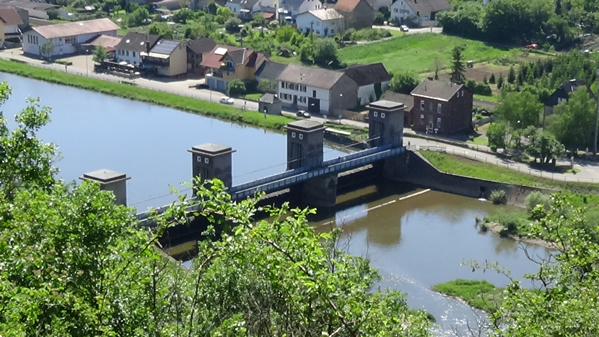 Nach einer Weile erreicht man einen Abzweig, der zu einem „Stauseeblick“ führt. Etwas seltsam, da in der Nähe nichts von einem Stausee bekannt ist. Es handelt sich auch nur um das Stauwehr Niederhausen, ein Wasserkraftwerk, das unter Denkmalschutz steht. Aber zugegeben, der Blick ist sehr schön, allein weil man wieder auf den Lemberg gucken kann.