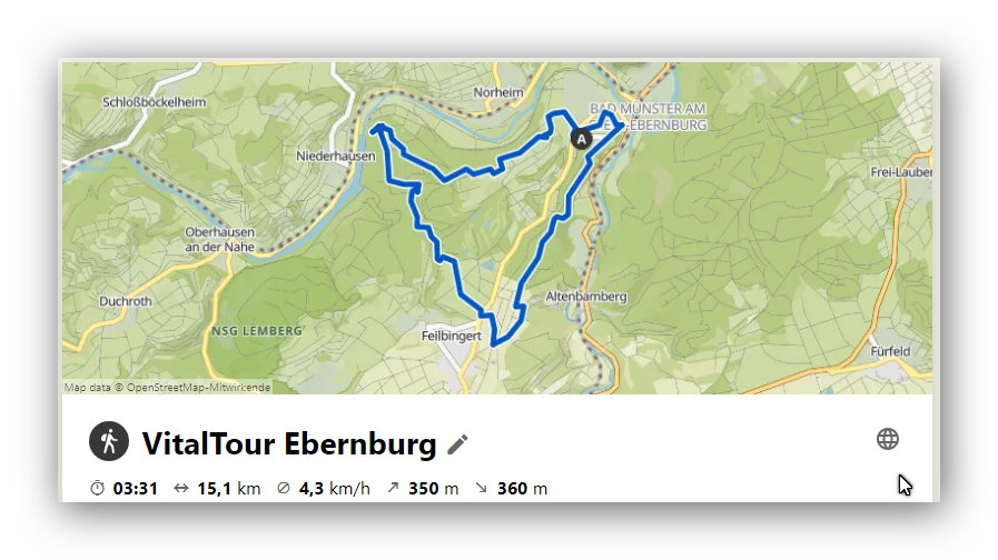 Nach der – abgekürzten – Bärenroute gleich noch eine Vitaltour hintendrauf. Diesmal 15 Kilometer rund um Bad Münster am Stein/Ebernburg am berühmten Rotenfels.