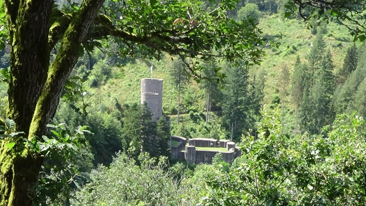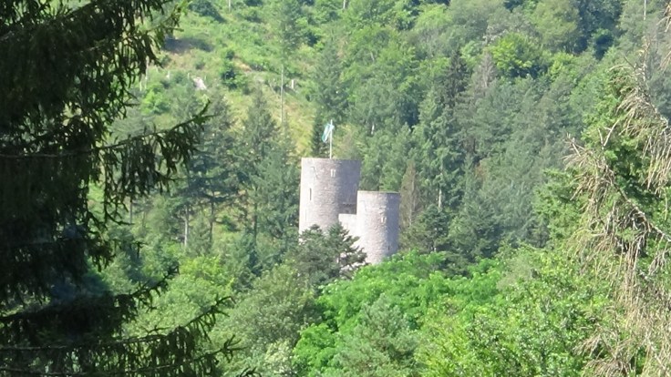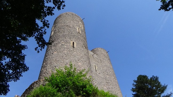 Nach vielleicht hundert Metern ist immer noch nichts von der Burg zu sehen, doch dann tauchen die ersten Mauerreste auf, ein schmaler Trail zweigt nach rechts ab und dann erheben sich plötzlich die trutzigen Mauern der kleinen Burg. Die Ruine ist sehr gepflegt und gut erhalten bzw. restauriert. Es gibt nicht allzu viel zu sehen, die Türme sind verschlossen, aber nach Anmeldung kann man wohl eine Führung durchs Innere bekommen. Übrigens, einer Legende zufolge war im linken, kleineren Turm einst Rapunzel zuhause 🙂