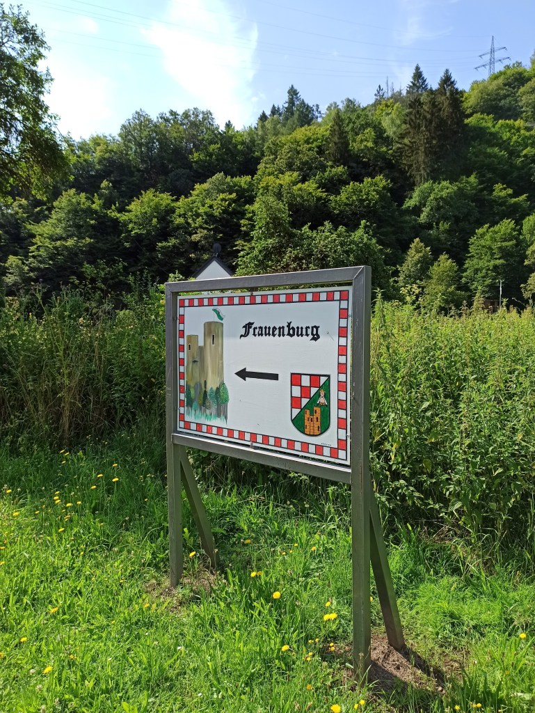 Über die B41 gelangt man nach etwa einer Stunde – je nach Verkehr natürlich – nach Frauenberg, wo in der Bahnhofstraße direkt am Ufer der Nahe ein sehr schöner Wanderparkplatz wartet. Eine Infotafel nebst Flyern hält Informationen über die Besonderheiten der Gegend bereit. Direkt am Parkplatz schon der Hinweis auf das erste Highlight, nämlich die Frauenburg.