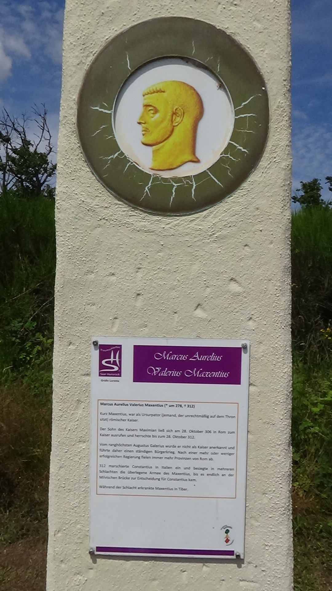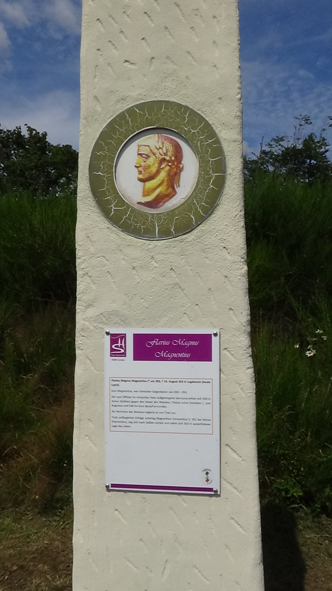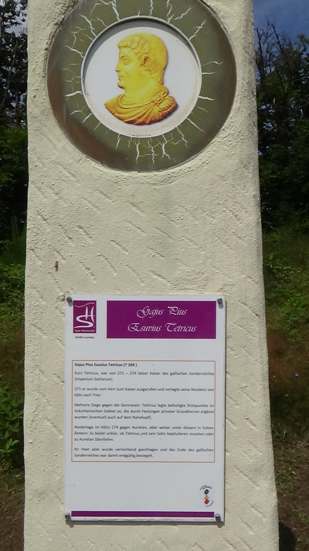 Im Anschluss an die Allee erreicht man einen weiteren Rastplatz, wo man zwei steinerne Nachbildungen römischer Kampfschilde aufgestellt hat. Über eine kurze Schleife durch eine duftende Wiese gelangt man zurück auf den Wanderweg und kommt kurz darauf zu einer Stelle, an der sich Untersuchungen zufolge einst ein römisches Zugangstor befunden haben soll.