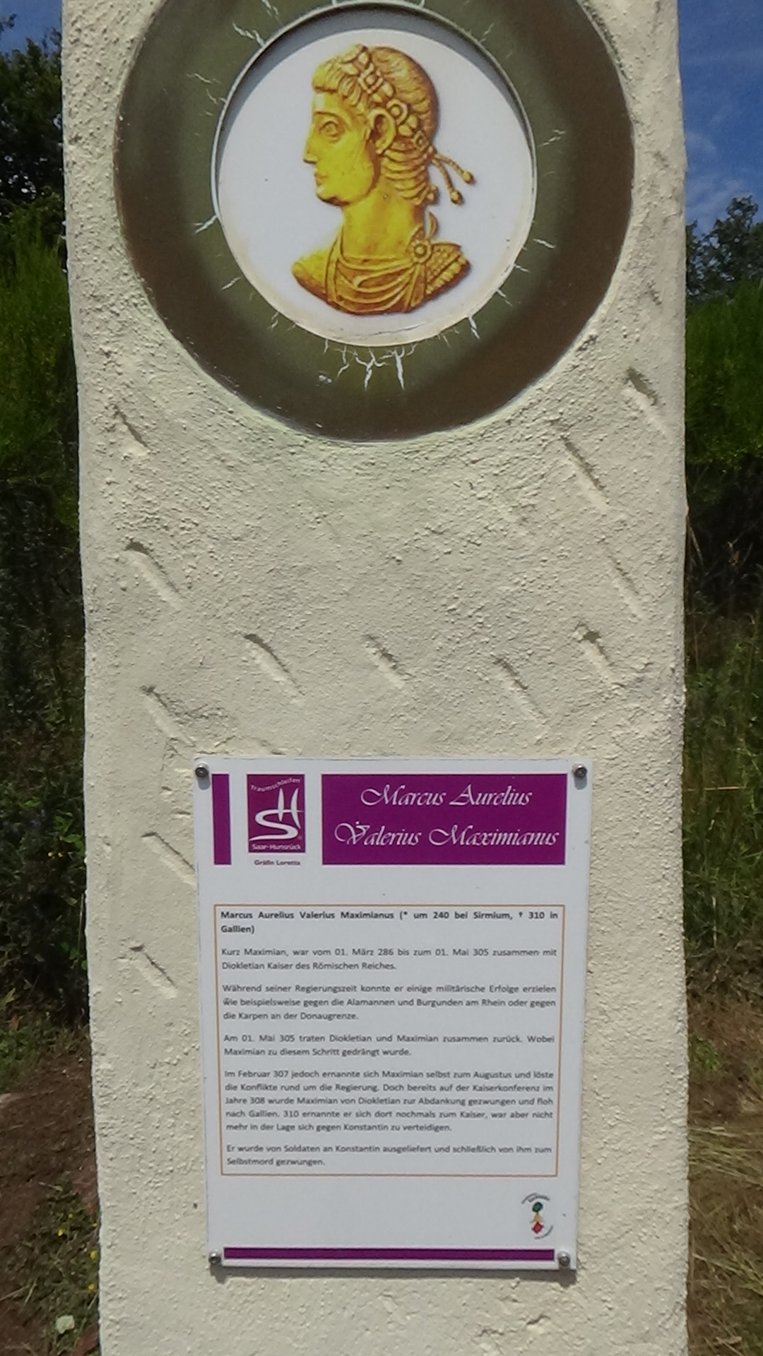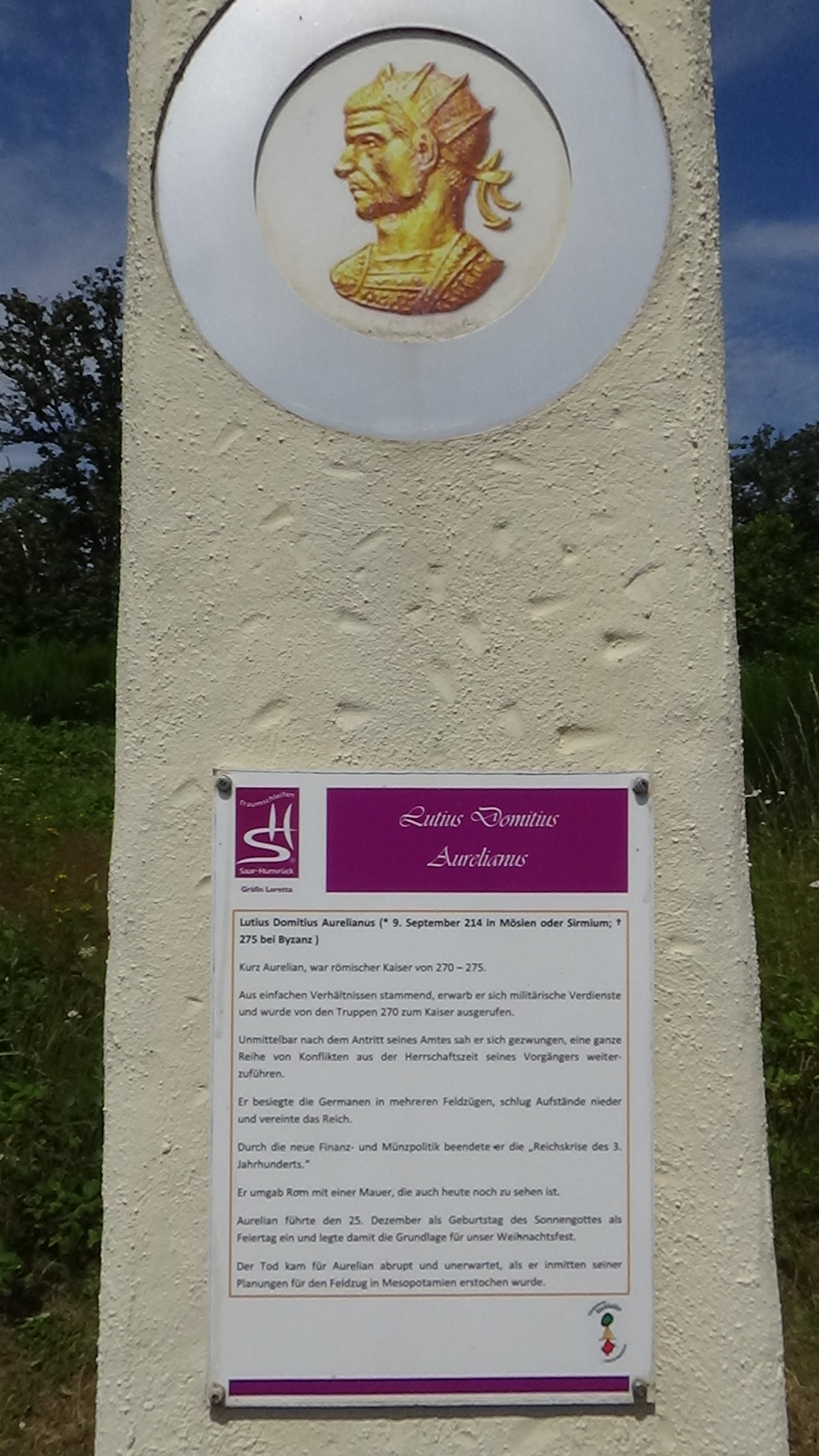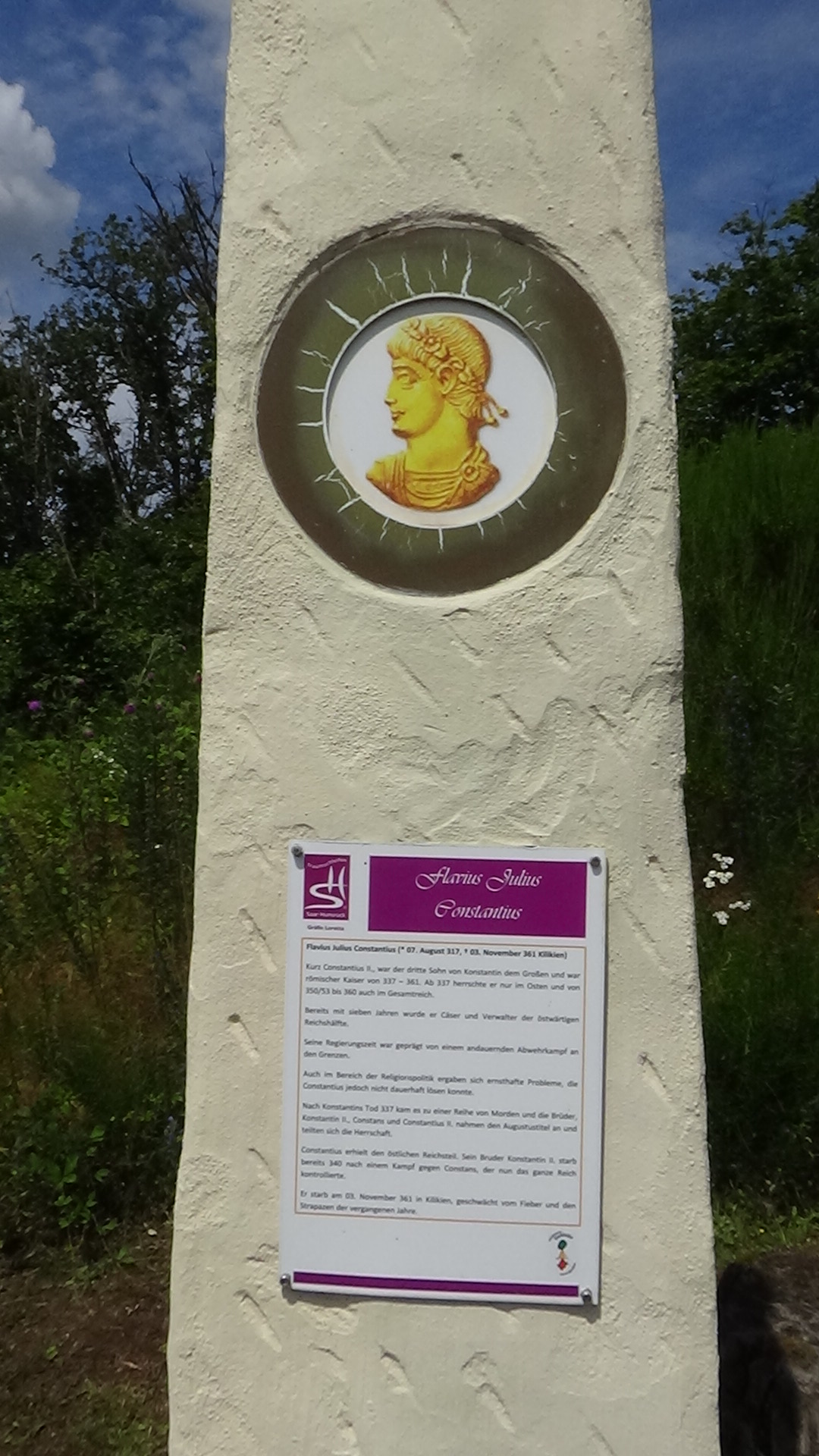 Im Anschluss an die Allee erreicht man einen weiteren Rastplatz, wo man zwei steinerne Nachbildungen römischer Kampfschilde aufgestellt hat. Über eine kurze Schleife durch eine duftende Wiese gelangt man zurück auf den Wanderweg und kommt kurz darauf zu einer Stelle, an der sich Untersuchungen zufolge einst ein römisches Zugangstor befunden haben soll.
