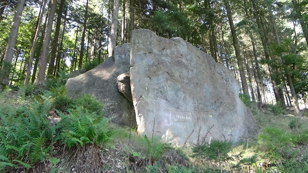 Der „Hochfels“ – so wird vermutet – bestand einst aus zwei Stütz- und einem Deckstein. Letzterer ist irgendwann zwischen die beiden Seitenteile gerutscht, wo er heute noch eingeklemmt liegt.