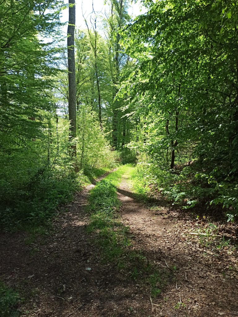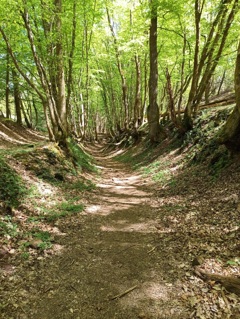 Los geht’s auf einem schmalen, unscheinbaren Wanderpfad, der sich stetig bergab durch den Wald schlängelt. Ich liebe solche Wege! Man weiß nie, was sich hinter der nächsten Kurve verbirgt. Ein Felsen? Eine Aussicht, die sich plötzlich zwischen den Bäumen auftut? Die Natur ist voller Überraschungen!