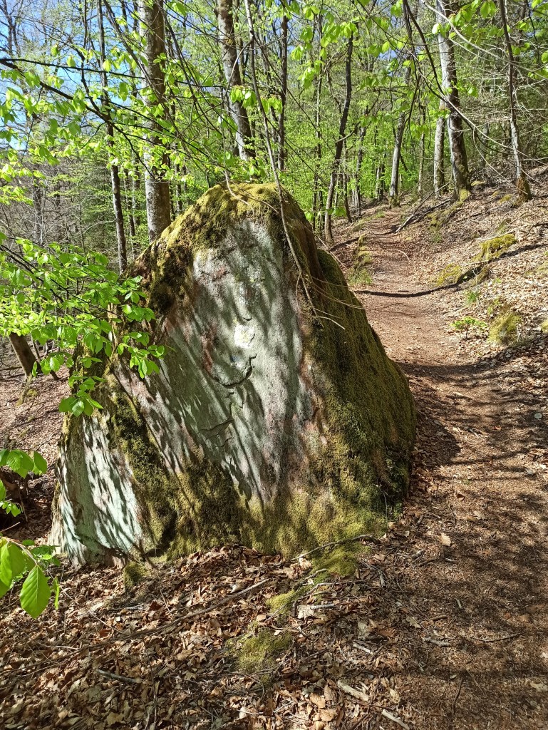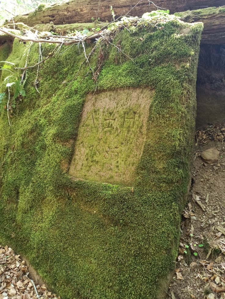 Weiter geht es auf einem angenehm zu laufenden Weg entlang des Baches durch ein Tal. Dann erregt ein gravierter Felsen meine Aufmerksamkeit. Was es damit wohl auf sich hat?