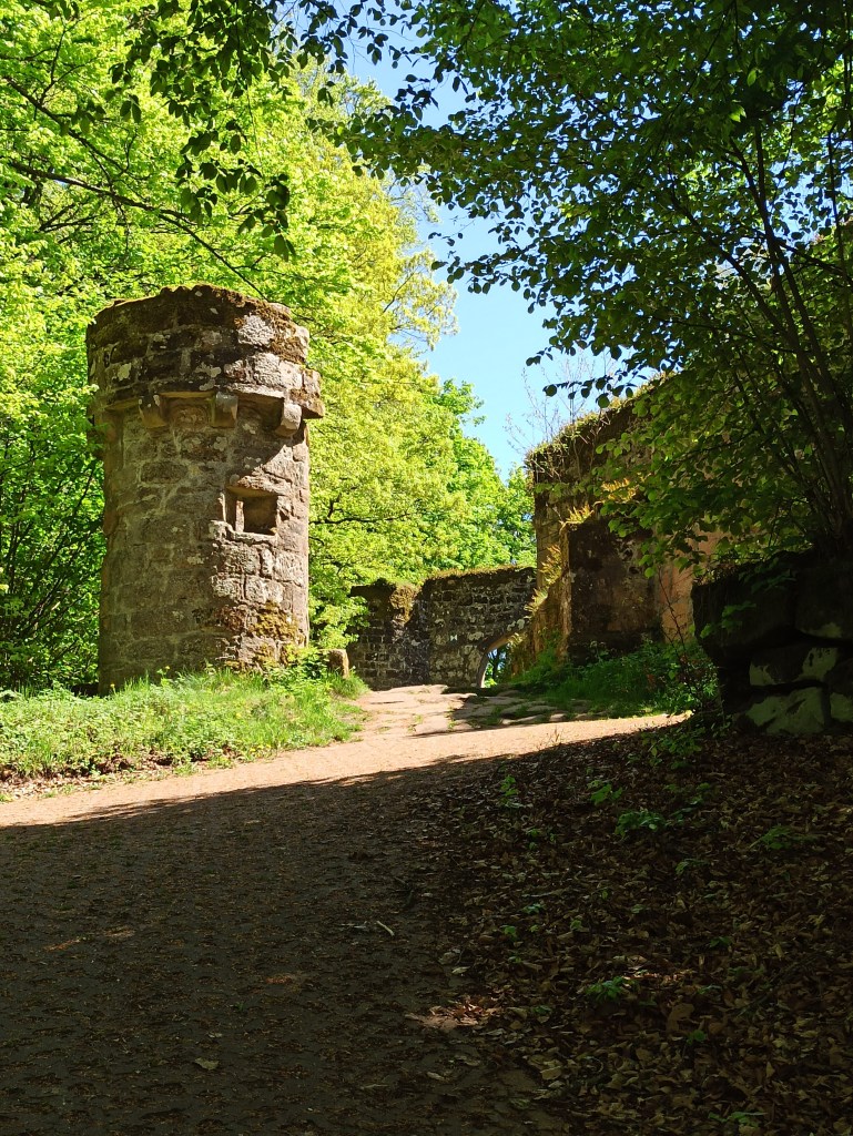 Anschließend nähert man sich Merzalben und eigentlich führt Komoot den Wanderer ein Stück durch den Ort, dann außenherum und schließlich zur Gräfensteinhütte, einem bewirtschafteten Ausflugslokal. Von der Hütte aus folgt man einem etwas düsteren, aber umso reizvolleren Hohlweg stetig bergauf bis auf ein Plateau, von dem es erneut recht stramm aufwärts geht, bis man schließlich die Ruine erreicht hat. An der Stelle kommt einem der Weg offen gestanden schon etwas länger vor, als nur knapp 9 Kilometer, was aber auch der Tatsache geschuldet ist, dass man nach der langen Zeit doch etwas aus der Übung ist.
