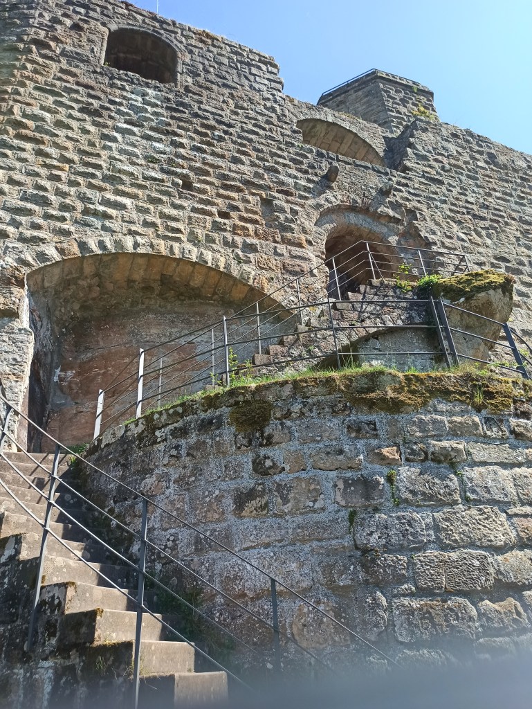 Ein echtes Highlight ist der begehbare Turm. Es sind zwar sogar kleine Lampen mit Bewegungsmelder eingebaut, damit man stellenweise was sieht, ich empfehle aber trotzdem eine Taschenlampe für den Aufstieg. Von oben hat man einen absolut wunderschönen Ausblick über den herrlichen Pfälzerwald mit seinen vielen Hügeln und Bergen.