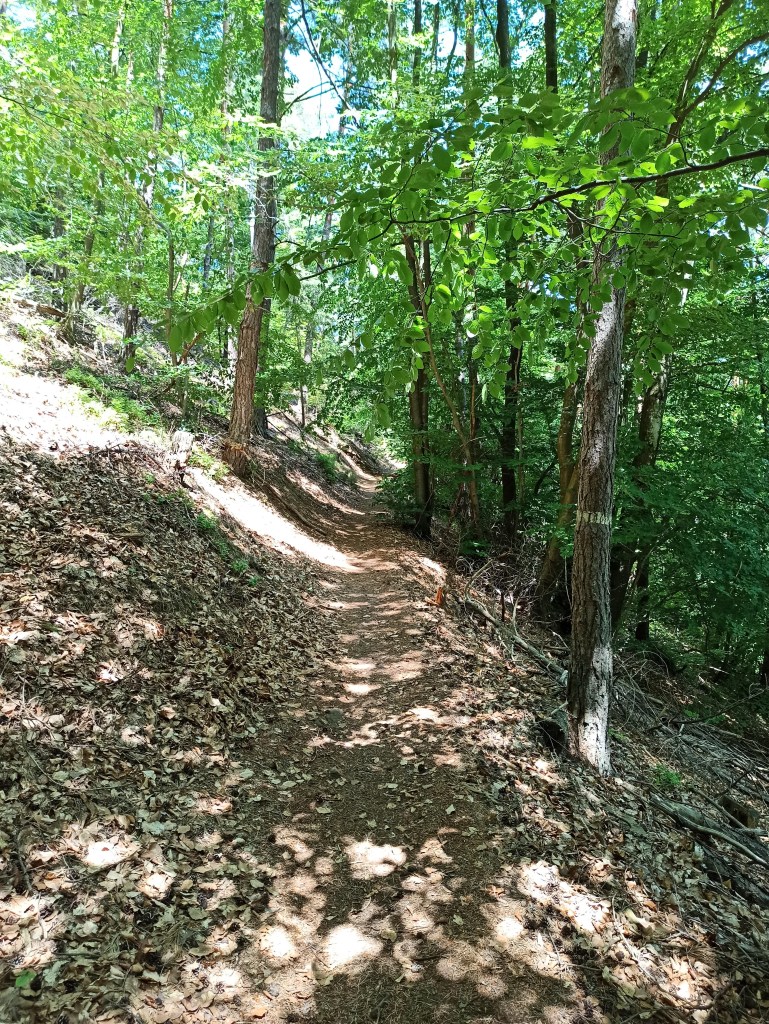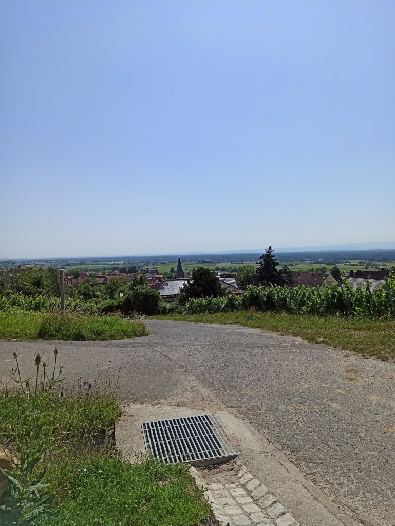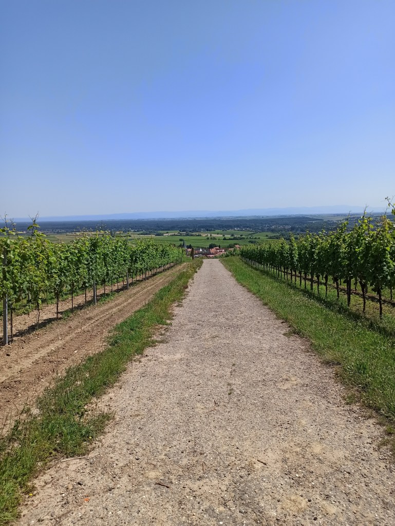 Weiter geht’s durch sonnenverwöhnte Weinberge auf größtenteils asphaltierten Wirtschaftswegen. Auffällig sind – neben der ohnehin schönen Pflanzenwelt am Wegrand – die wunderbaren Rosenstöcke an manchen Weinreben. Ein Pfosten mit mehreren Schildern ist dann der erste Hinweis, dass man sich nicht mehr in heimischen Gefilden befindet. Immer wieder mal passiert man schattige Abschnitte, bis man dann schließlich kühlen Wald betritt.