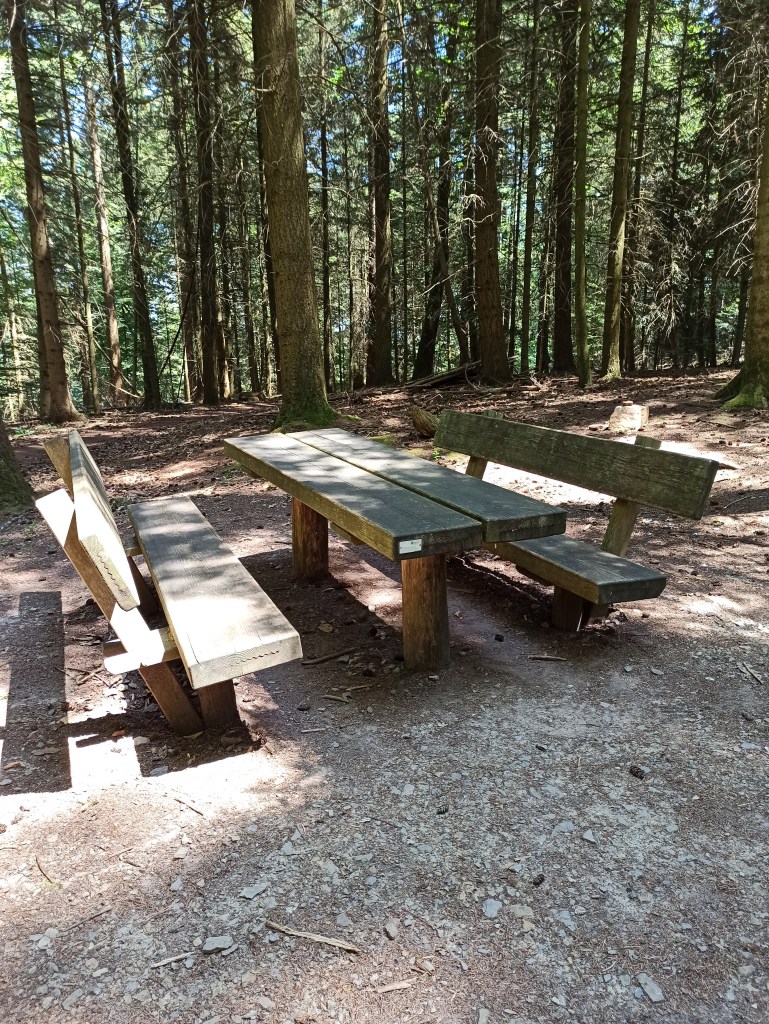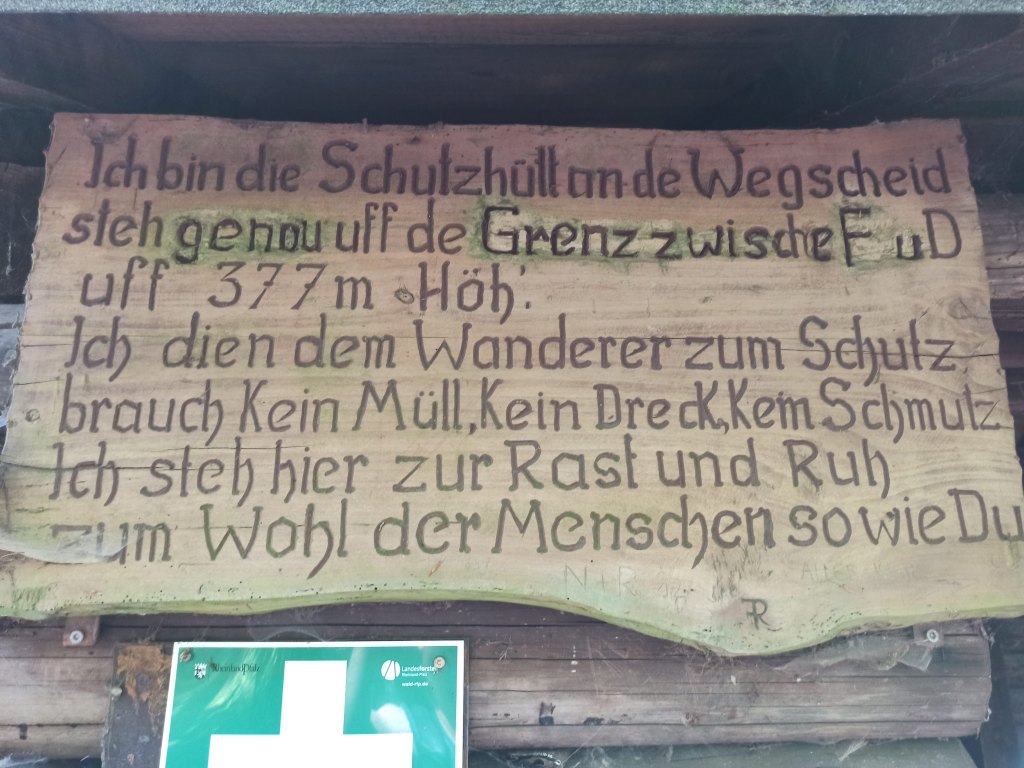 Direkt auf der Grenze zwischen Deutschland und Frankreich steht dann – oh Wunder – tatsächlich die erste Wanderhütte nebst einer Rastbank. Man glaubt es kaum und stürzt direkt darauf zu 🙂 Es ist die „Schutzhütte an der Wegscheid“, die sich mit einem putzigen Spruch dem Wanderer vorstellt.