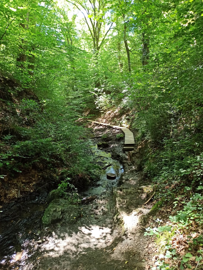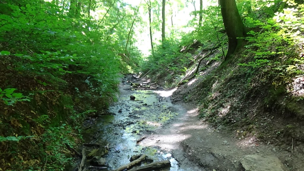 Der Weg beginnt direkt am Stellplatz und verläuft ein Stück entlang der Lahn, wo kleine Boote und Yachten zu Wasser liegen, man unterquert zwei Brücken und dann geht’s auch schon ganz ordentlich bergauf! Die Straße „Zum Allerheiligenberg“ hat es wirklich in sich, sie führt auf den gleichnamigen Berg, wo man oben angekommen tatsächlich so allerlei Heilige halluziniert! Naja, nicht ganz, aber oben ist es höchste Zeit für den ersten Klamottenwechsel, denn das Hemd ist komplett durchgeschwitzt! Dafür geht es dann aber – endlich! – auf schattigen Waldwegen weiter zur Klamm.
