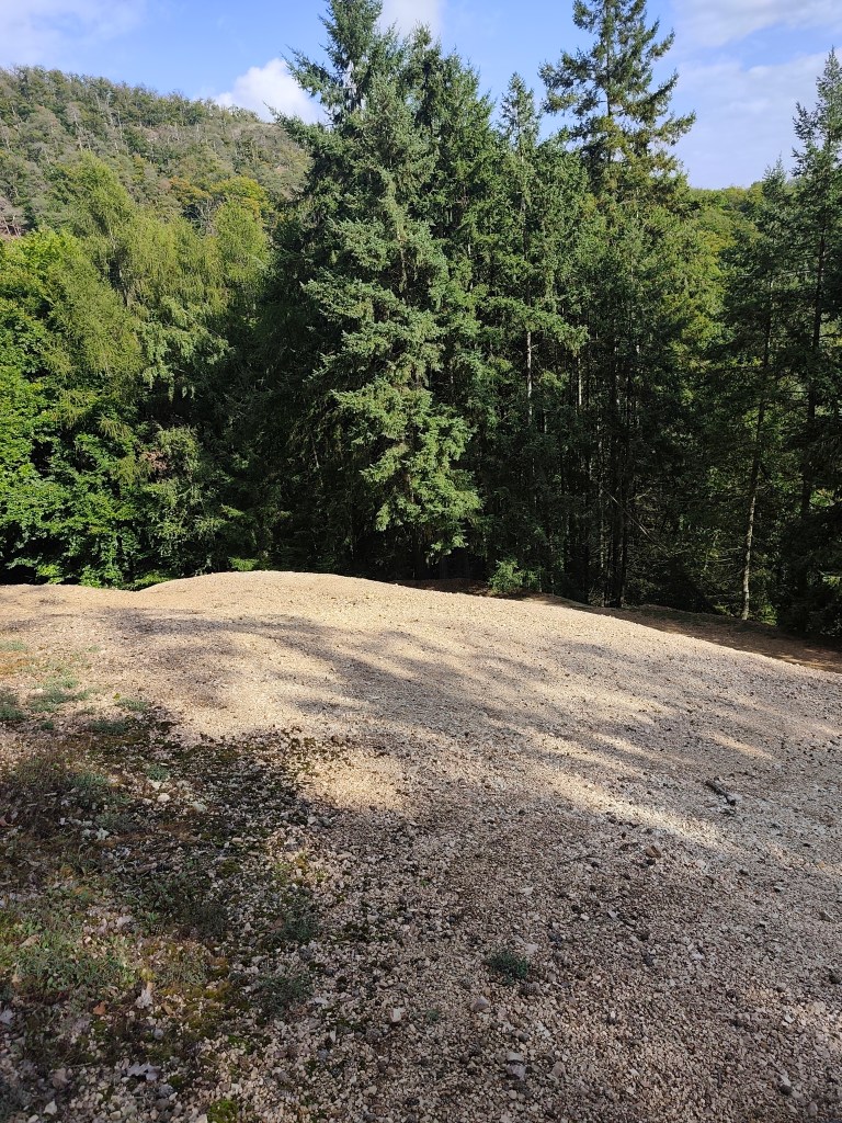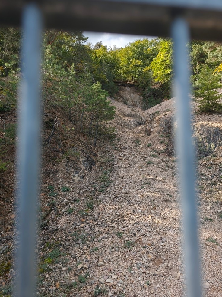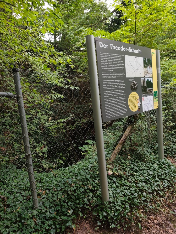 Nach einiger Zeit erreicht man ein weiteres Relikt, von dem allerdings nicht mehr viel zu sehen ist. Zunächst der zugewachsene, ehemalige „Theodor-Schacht“ und dann die Reste der sogenannten „Rollbahn“, eine Anlage für den Transport des abgebauten Gesteins.