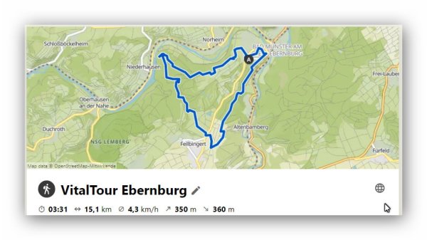 Nach der – abgekürzten – Bärenroute gleich noch eine Vitaltour hintendrauf. Diesmal 15 Kilometer rund um Bad Münster am Stein/Ebernburg am berühmten Rotenfels.
